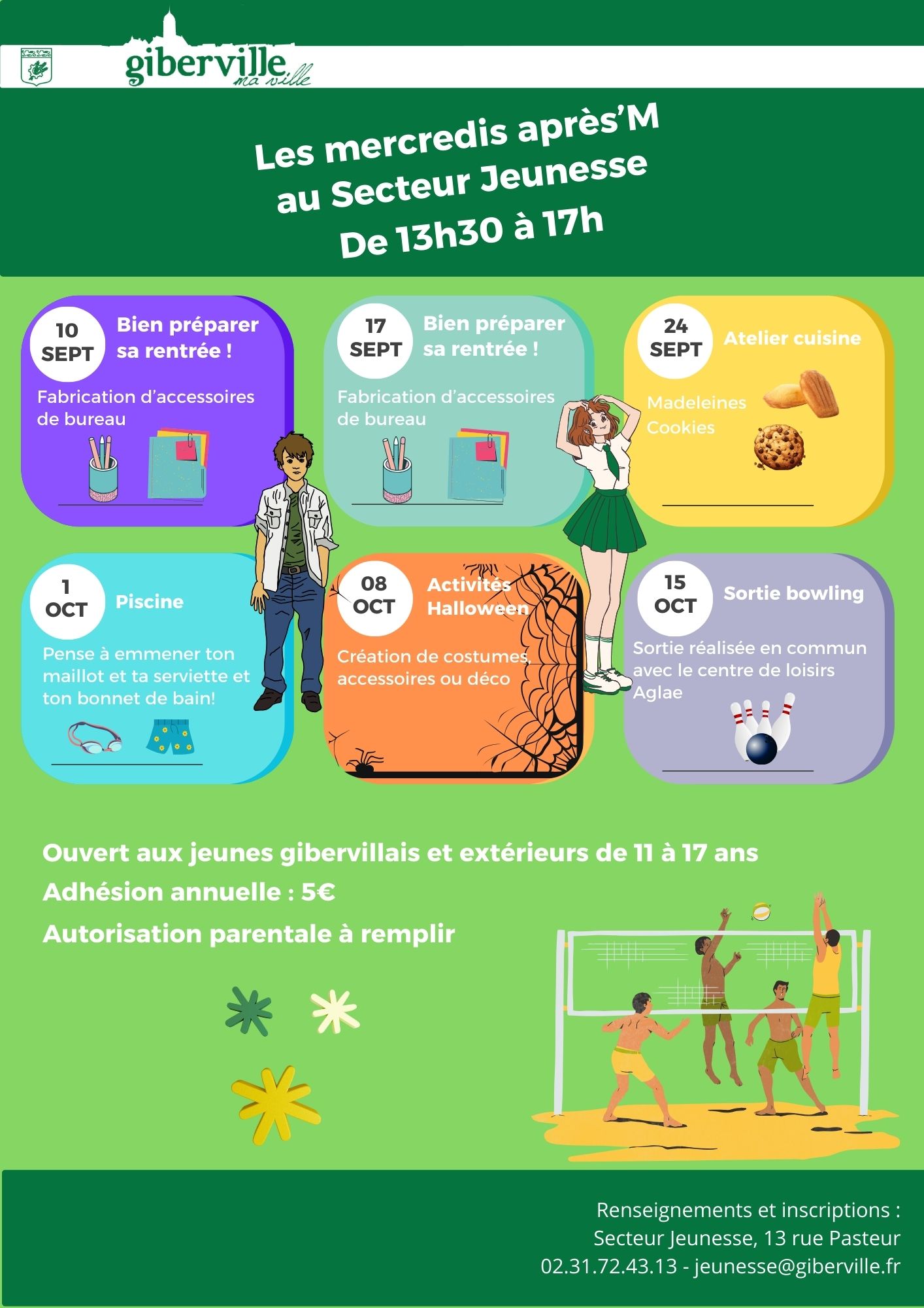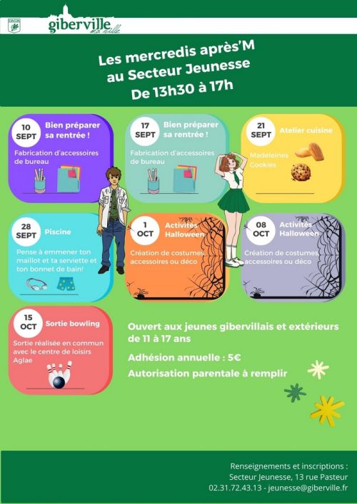 Renseignements et inscriptions au Secteur Jeunesse 13, Rue Pasteur - Tel. 02 31 72 43 13 jeunesse@giberville.fr